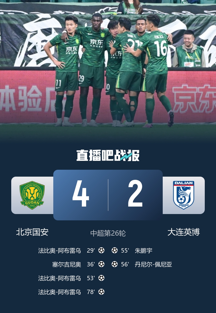 国安终止三连败以4-2战胜大连英博,法比奥帽子戏法助攻塞鸟表现出色_中超直播免费直播视频直播