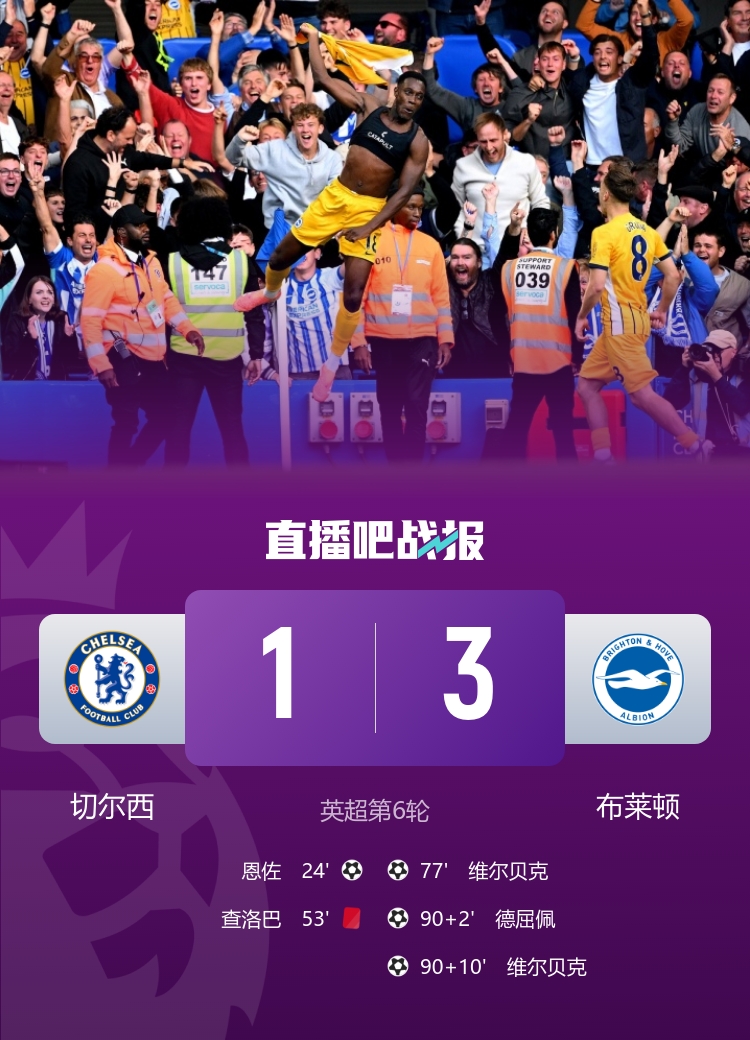 可好戏才刚刚开始,到了下半场,切尔西的查洛巴竟然给主裁判送上一张“红色请柬”,用行动告诉大家“我们在坚持不懈地追求红牌”的新目标,毕竟,连着两轮吃黄牌、红牌,这样的表现简直让人叹息。随后,维尔贝克展现了他顶级前锋的本能,打破了切尔西的美梦,接连在比赛的最后时刻完成逆转,带领布莱顿以3-1的比分让切尔西体验了一把心碎的快感。