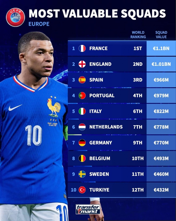 欧洲国家队身价排名:法国位居第一,英格兰位居第二_足球直播
