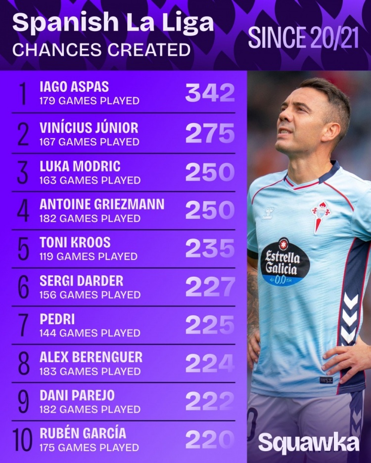 西甲机会之王榜单揭晓阿斯帕斯夺魁维尼修斯紧随其后_西甲直播