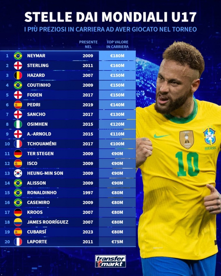 曾征战U17世界杯的球员身价排行榜:内马尔以1.8亿欧元位居首位,斯特林紧随其后_英超直播免费观看