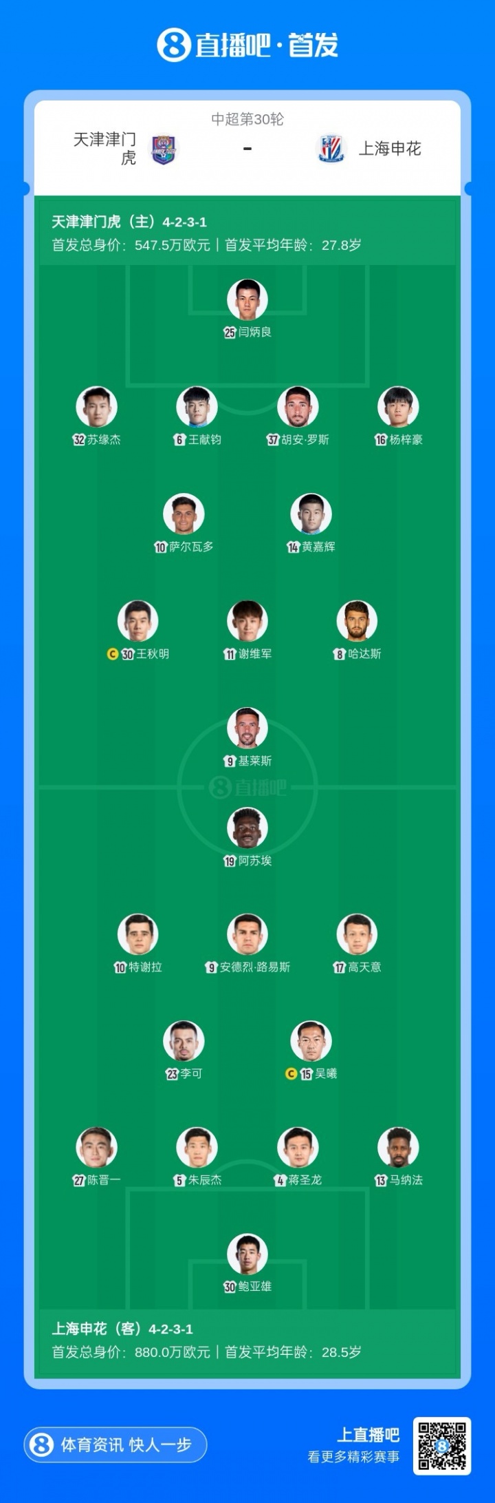 11月22日15:30,中超第30轮即将上演一场备受瞩目的对决,天津津门虎将在主场迎战上海申花。两队的首发阵容已正式公布,令人期待。