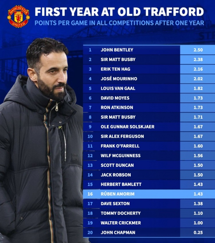 曼联主帅执教首年场均得分榜:滕哈格穆里尼奥名列三四位 阿莫林位居第十六_英超在线直播免费