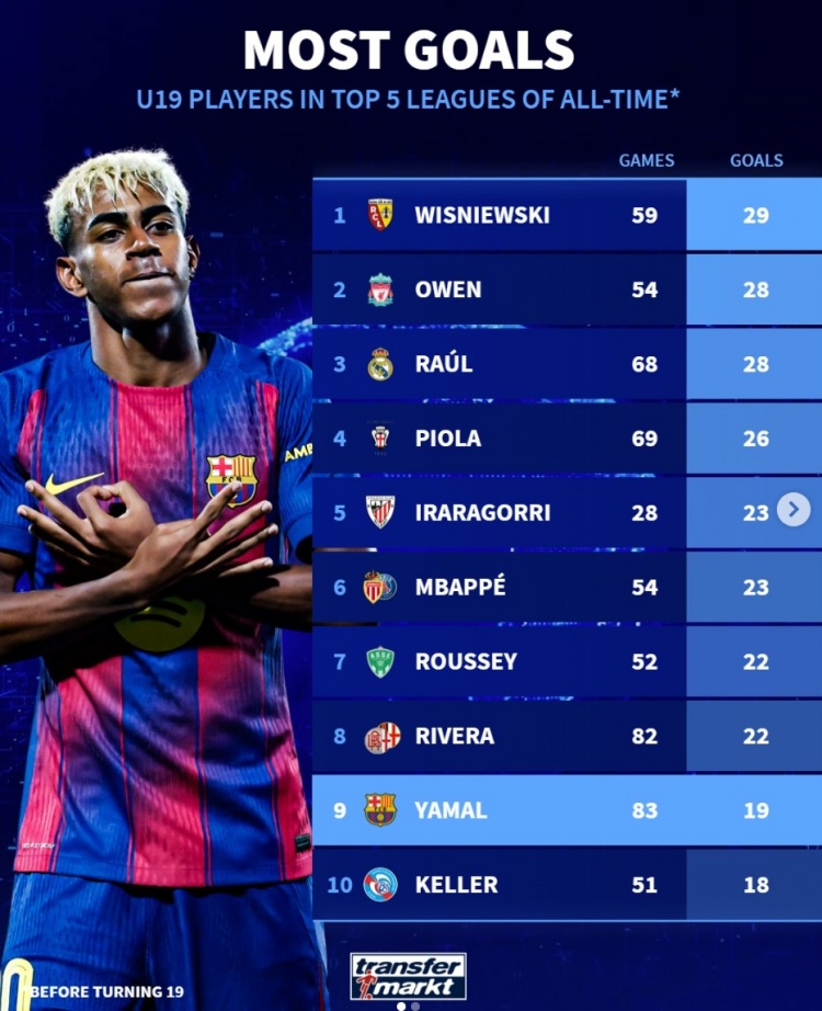 五大联赛历史U19进球榜揭晓 欧文 劳尔 姆巴佩领衔 亚马尔暂居第九位_西甲直播