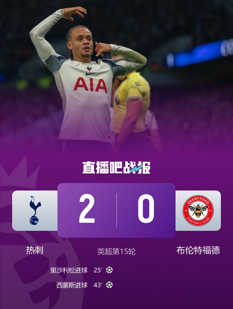 整场比赛结束,热刺以2-0战胜布伦特福德,迎来了这场梦幻般的胜利。比赛中,我们看到热刺在攻防两端的默契配合,以及西蒙斯和里沙利松的出色表现,也展现了球队实力的提升和团结一心的拼搏精神。