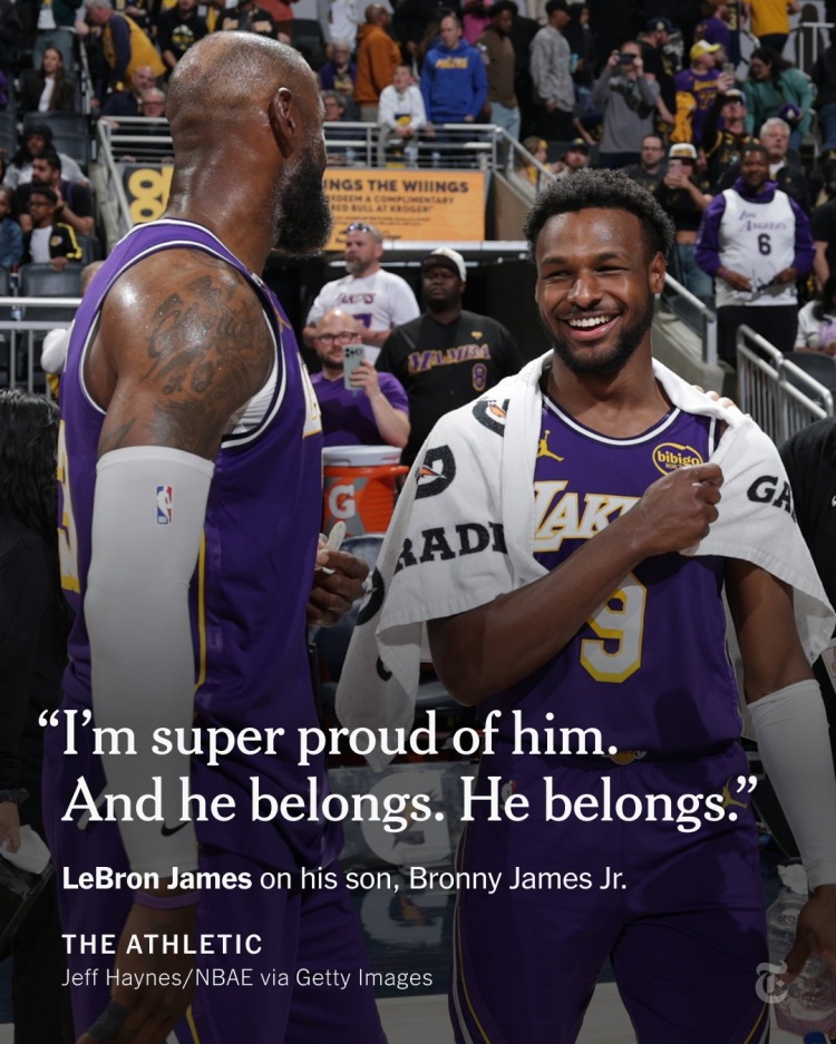 3月27日讯 在昨日的比赛中,湖人以137-130战胜步行者,湖人球星勒布朗·詹姆斯与他的儿子布朗尼共同出场,引人注目。赛后,詹姆斯接受了《The Athletic》湖人随队记者丹·沃伊克的专访,分享了他对儿子的感受。